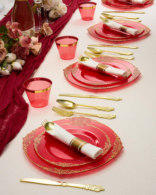 Goodluck 350 Piece Red Dinnerware Set for 50 Guests, Fancy Disposable Plates, Include: 100 Red Rim Plastic Plates, 150 Silverwares, 50 Pre Rolled Napkins, 50 Cups for Party, Wedding