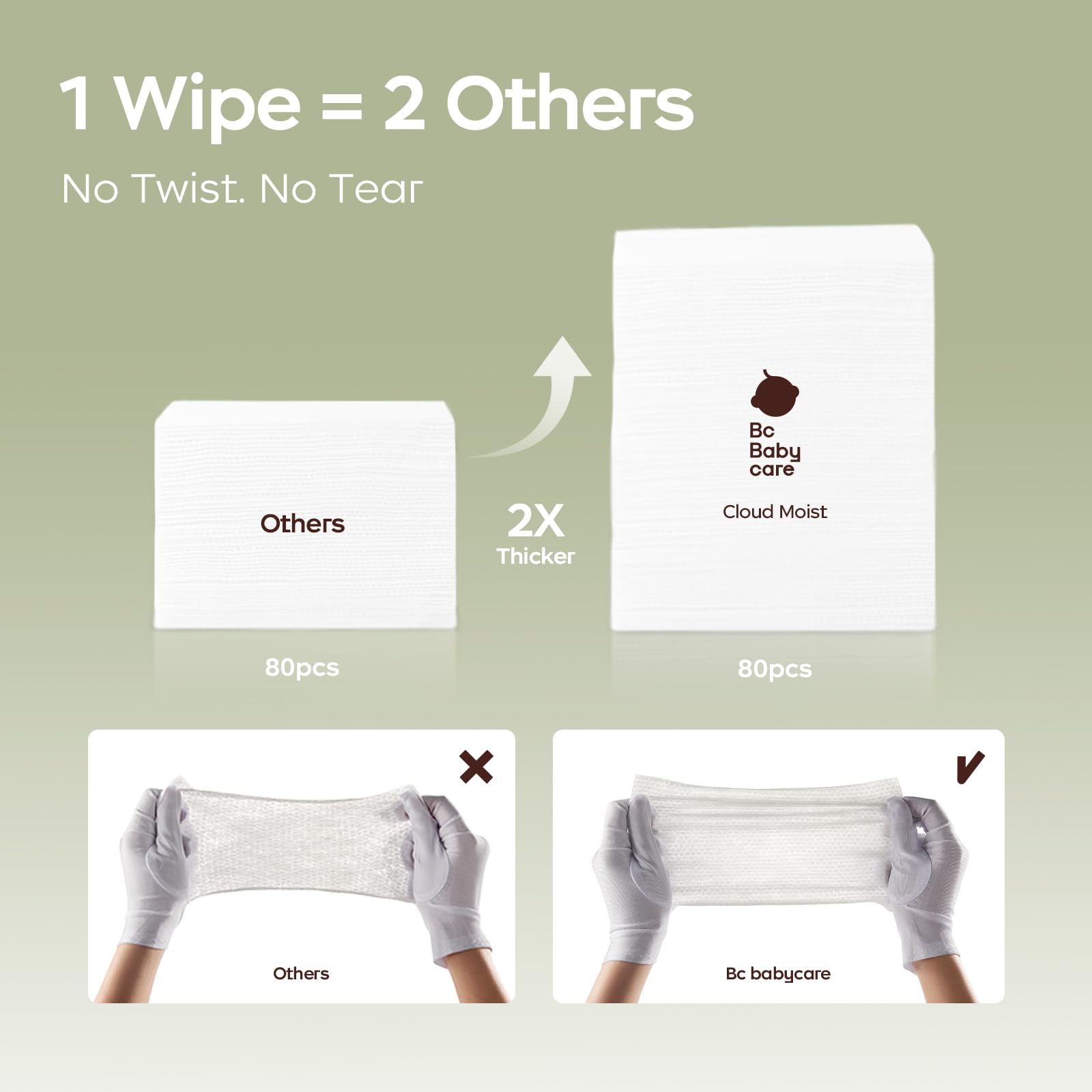 Bc Babycare Cloud Moist Baby Wipes, Thick & XL, 99% Water, Ultra-Hydrating, Unscented, Hypoallergenic for Sensitive Skin, Biodegradable, 3 Flip-Top, 240 Count