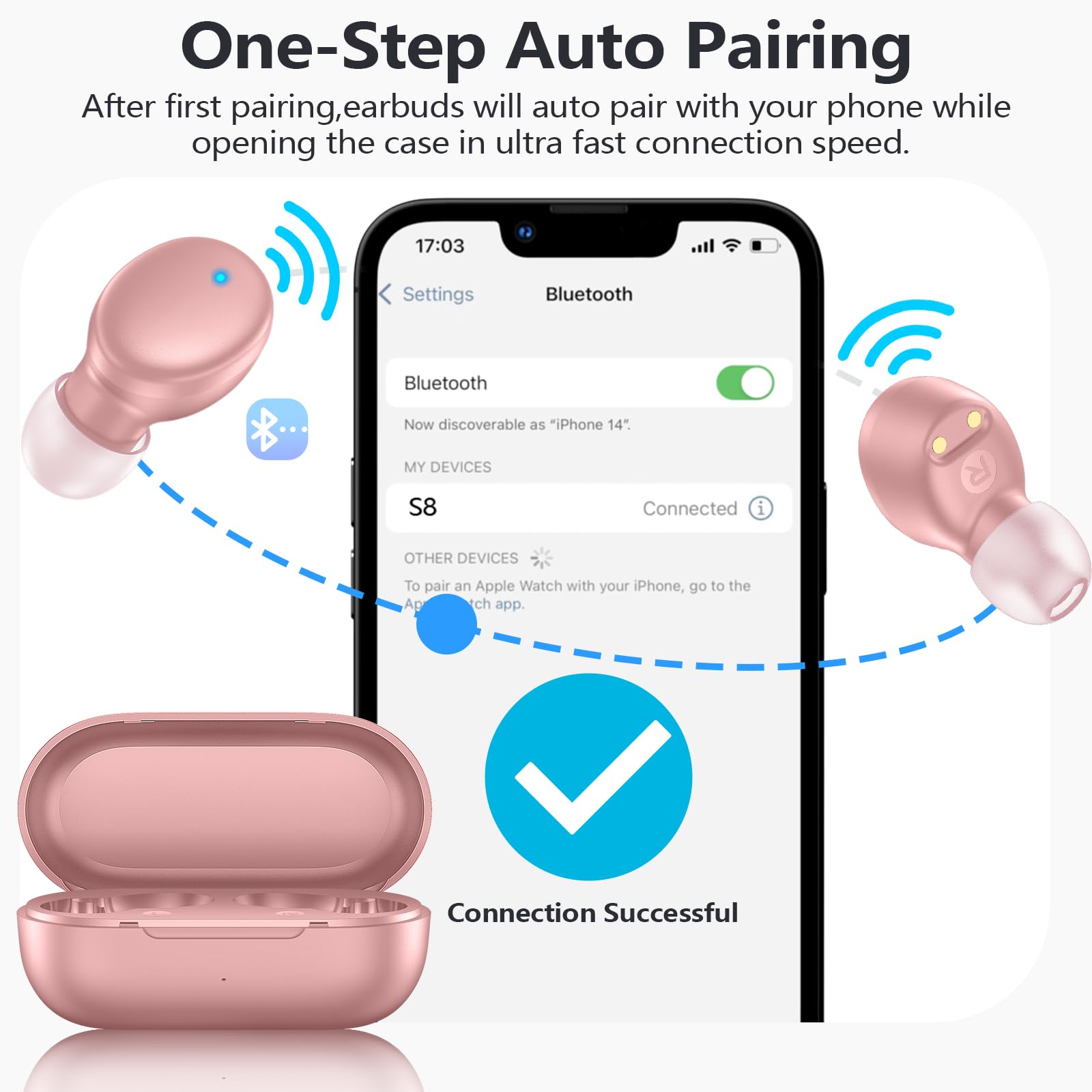 MOZOTER S8 Mini Wireless Earbuds Bluetooth 5.3 in Ear Light-Weight Headphones,60Hrs Playtime Ear Buds with Charging Case,Bluetooth Headsets,Premium Sound with Deep Bass for Sport-Pink