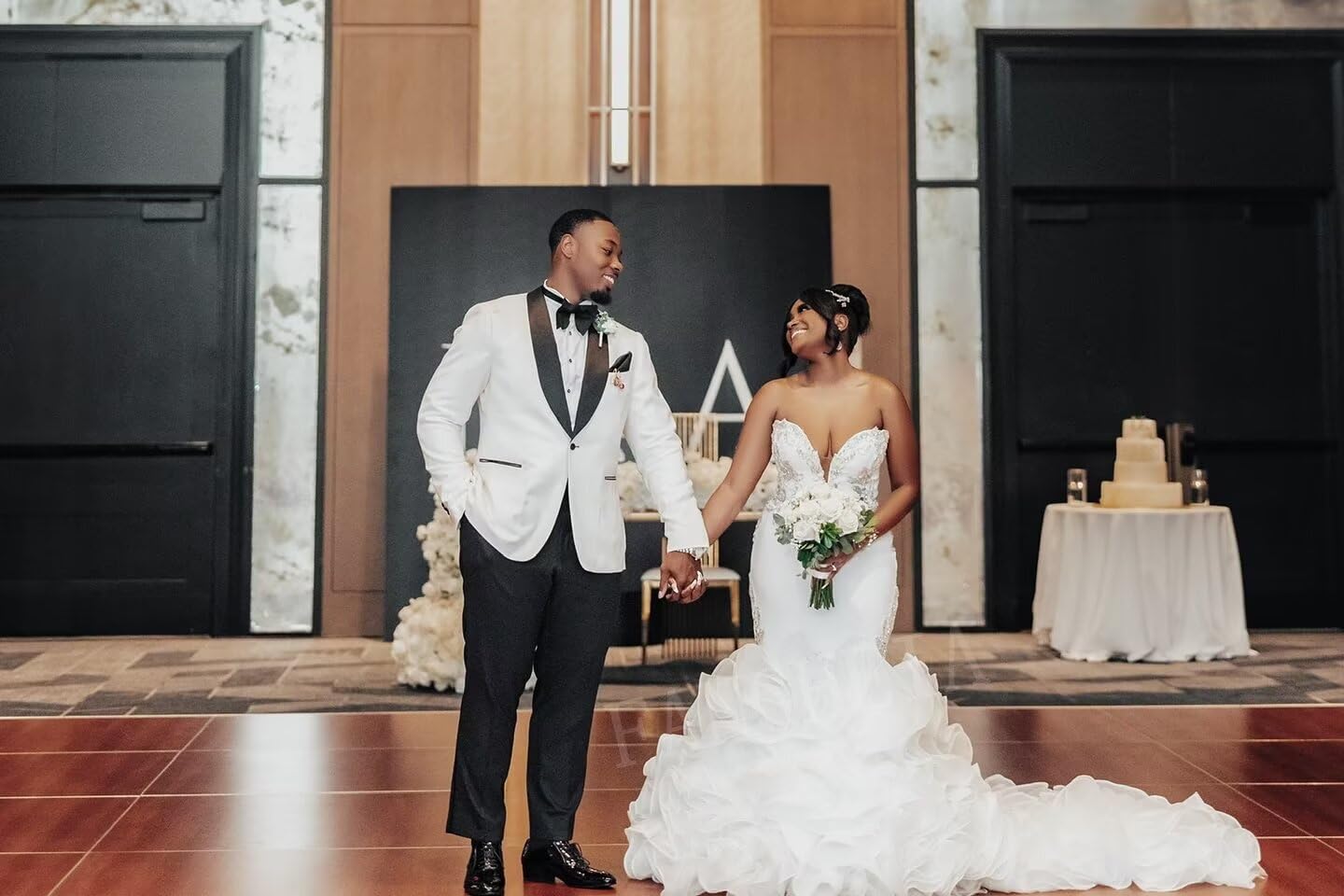 Strapless Sparkling Mermaid Bridal Dress for Wedding Rhinestones Applique Satin Luxury Wedding Gown with Ruffle Long Train White